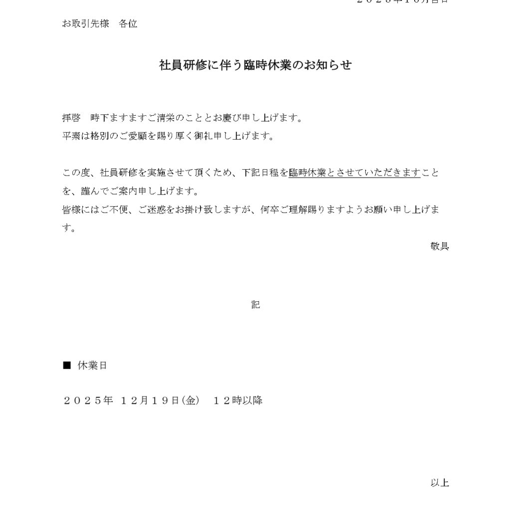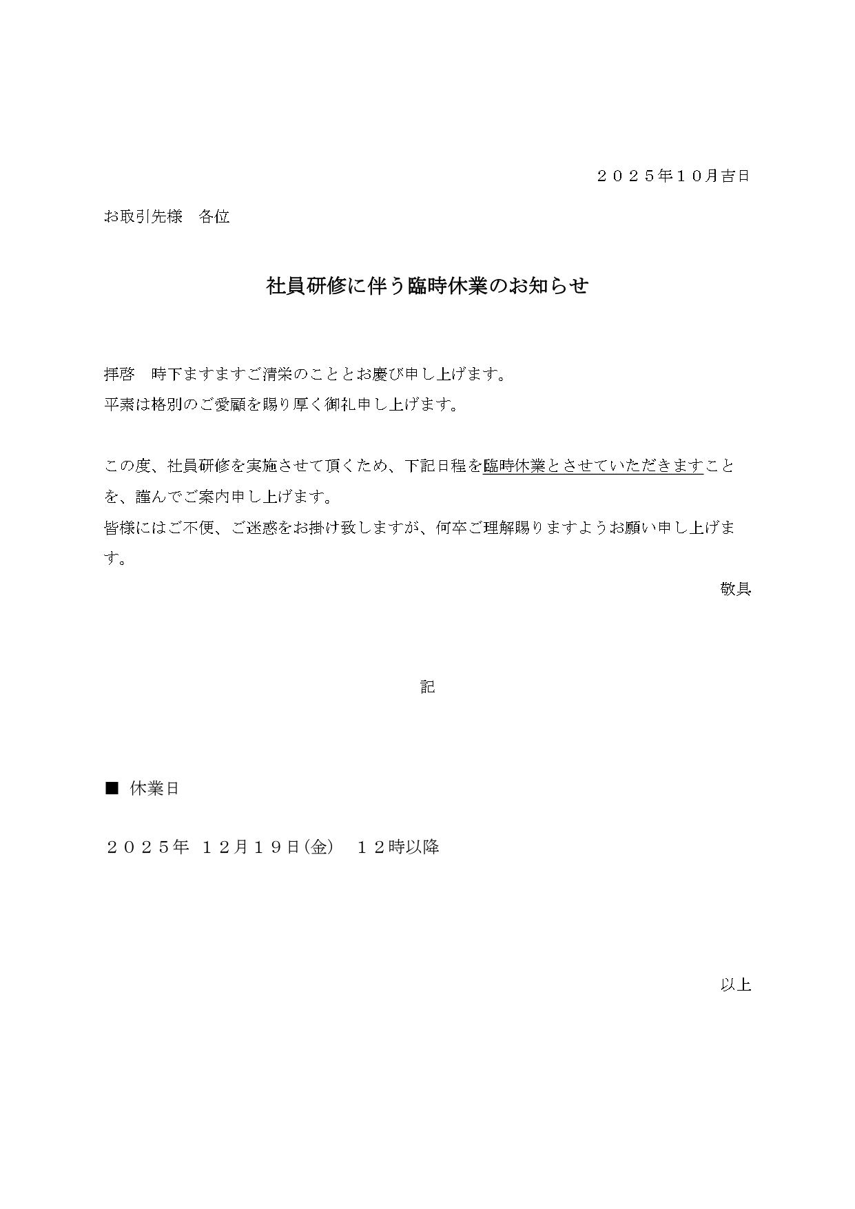 お知らせ 社員研修に伴う臨時休業のお知らせ 2025/10/20 NEWS 2025/10/20社員研修に伴う臨時休業のお知らせ 2025/07/28夏季休業についてのお知らせ 2025/04/01健康経営優良法人の認定を目指します。 2024/12/27楽楽明細 利用開始ご案内書面 郵送物の宛名記載誤りに関して 2024/12/19年末年始 休業のお知らせ