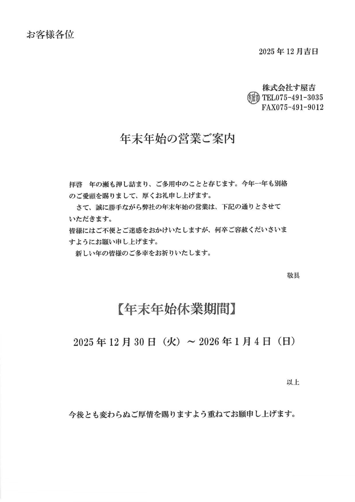 お知らせ 年末年始 休業のお知らせ 2025/12/04 NEWS 2025/12/04年末年始 休業のお知らせ 2025/10/20社員研修に伴う臨時休業のお知らせ 2025/07/28夏季休業についてのお知らせ 2025/04/01健康経営優良法人の認定を目指します。 2024/12/27楽楽明細 利用開始ご案内書面 郵送物の宛名記載誤りに関して